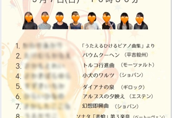 現在娘が通い始めて7年になります。負けず嫌いな性格で、ピアノでも間違えると落ち込んでしまうような娘だったので、当初は長く続くか不安でしたが、レッスンで先生が笑顔で「大丈夫だよ!」と何回も励ましてくださり、娘に合わせたレッスン内容を考えて下さったり、宿題を出してくれました。娘も「今日のレッスンも楽しかった!」と笑顔で帰ってきます。決して無理強いすることなく、さりとて、伝えるべき所はきちんと伝えて下さる先生に私も娘も心から信頼しています。今では娘も美しいクラッシックを弾けるまでになりました。