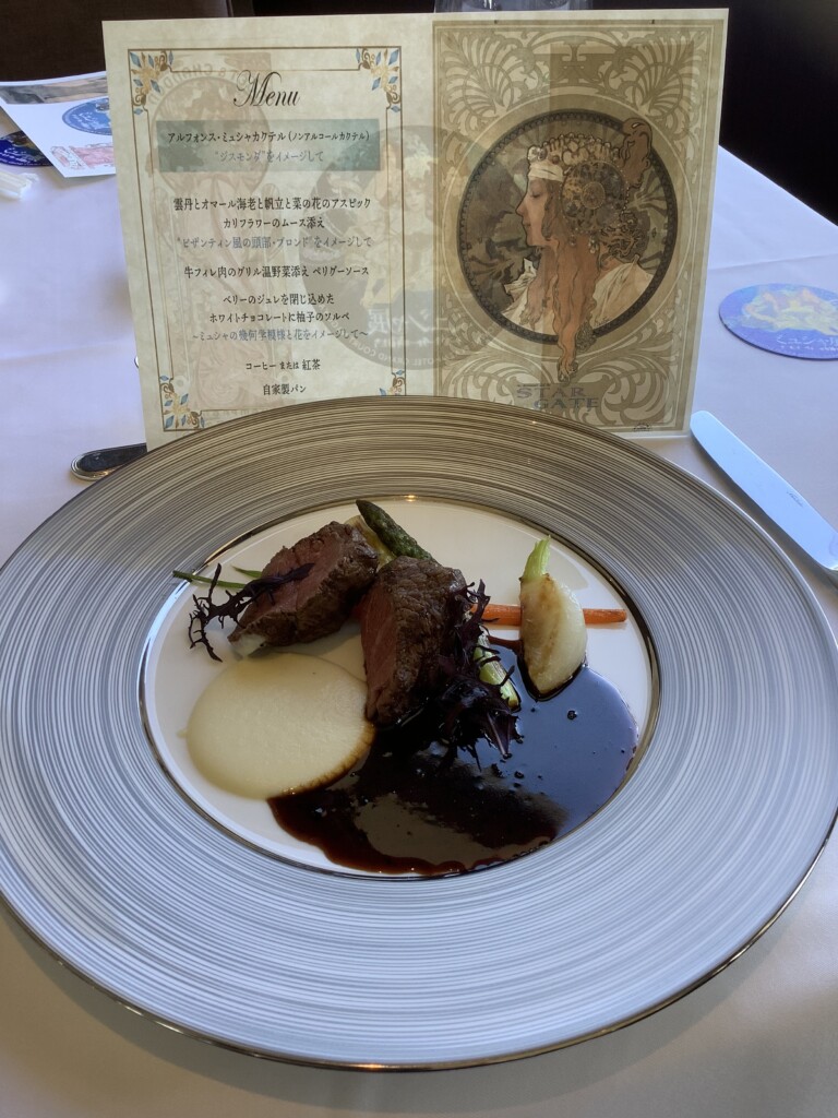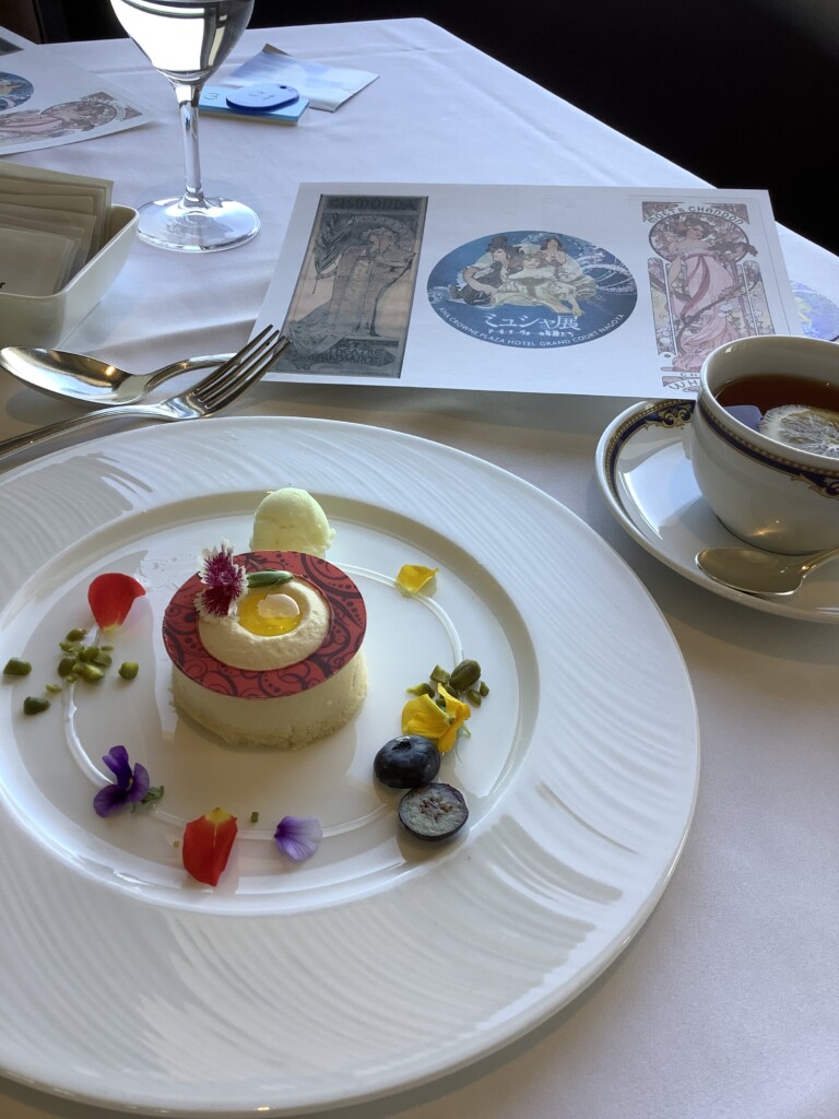 その後のミュシャ展とのコラボお料理も堪能してきました🤭 窓側の席も用意してくださり、スタッフの皆さんとても親切で、ミュシャに溢れた心地よい時間を持てました☕️