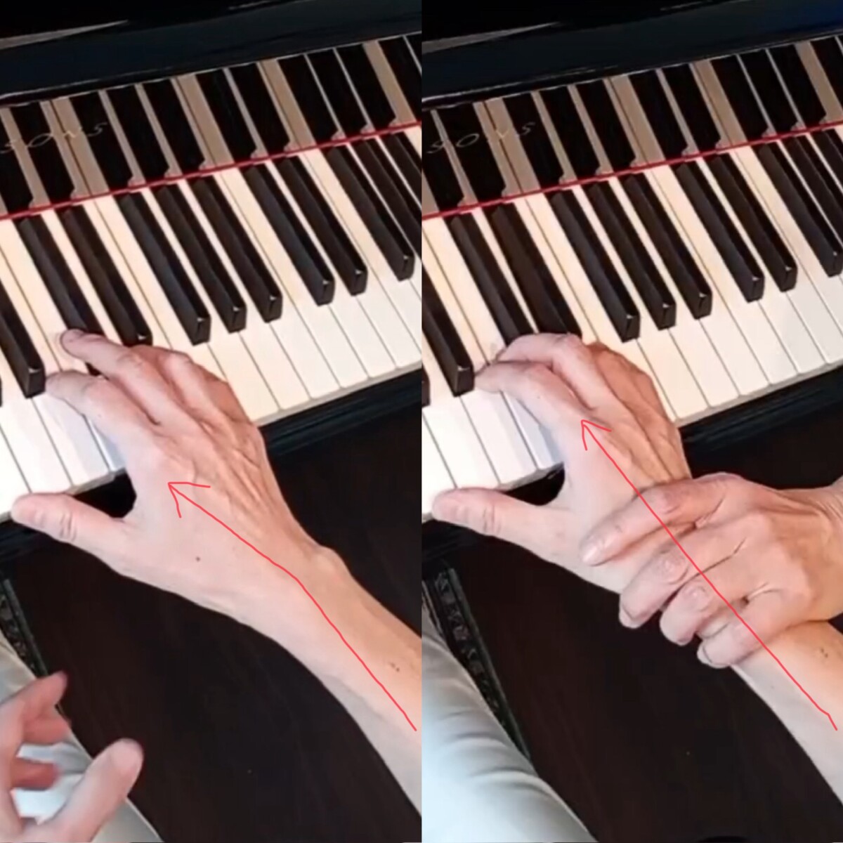 角度は微妙に違いますが、以前は伸筋側ではなく屈筋側で支え、指は鍵盤の向こうから手前へ引き寄せる奏法でした。……屈筋側に力こぶが凄かった💪頃。