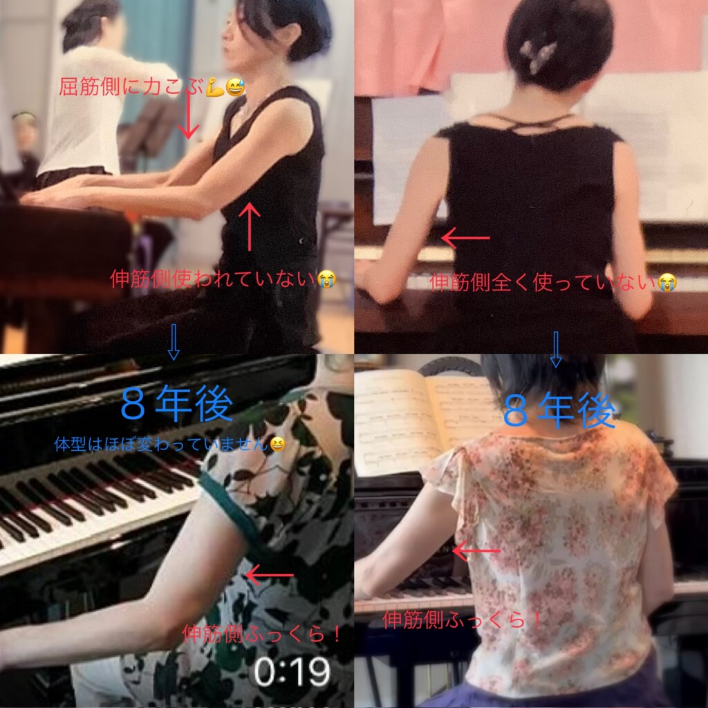 左手2番3番のジストニアの症状はもう出ないし、以前よりはずっとずっと楽に!そして美しい響きで弾けるようになりました。 肩、肘、腕は本来の使い方が随分と出来るようになってきたので、腕の筋肉のつきかたまで変わり👇😆👇