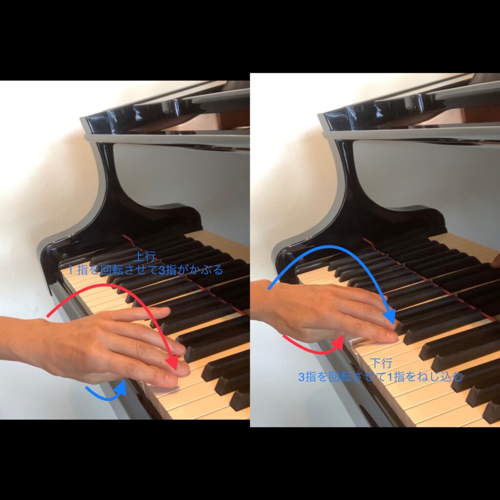速い曲はペタンコ弾きでは無理です。指くぐりも上行では1指(親指)を鍵盤上で回転、下行では3指(中指)・4指(薬指)をギリっと回転させてくぐらせるため手首ごとねじれます。