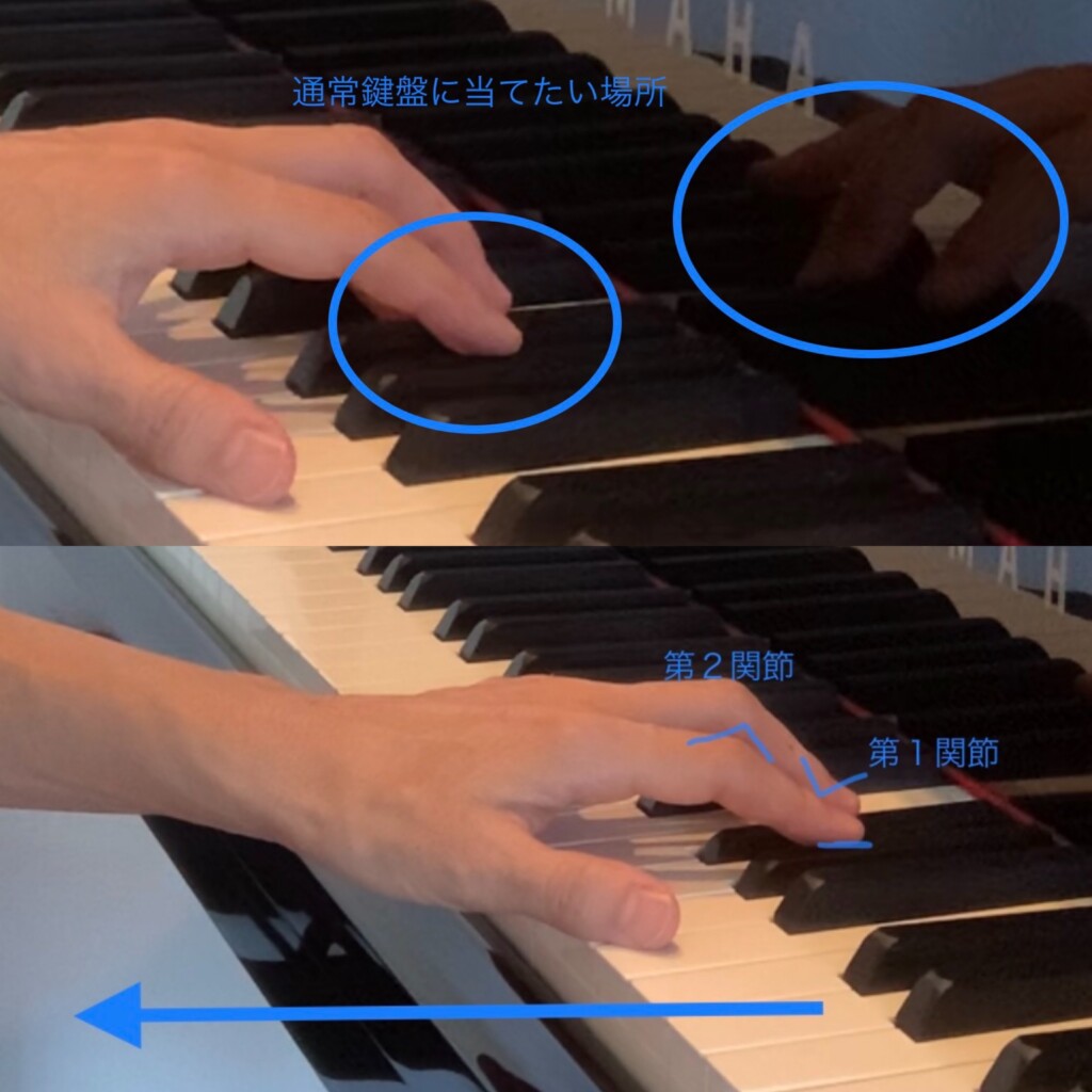 この自分側に寄せる弾き方は後々一番癖をはずしにくく、音域が広がっても手が開きにくく腕や指も痛めやすいですし、せっかく美しい曲が見られるようになっても音色の表現ができず、音楽がつまらなくなっていってしまいます。